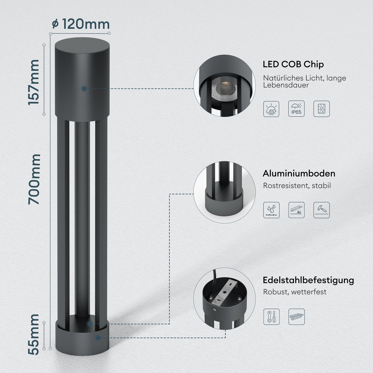 glasvilla Lampione da Giardino ⌀120xH700mm Luminoso da Giardino IP65 Lampada da Terra per Esterni 3000K Paletti Esterni 10W per Giardini, Parchi, Aree Residenziali e Ingressi NeoForge
