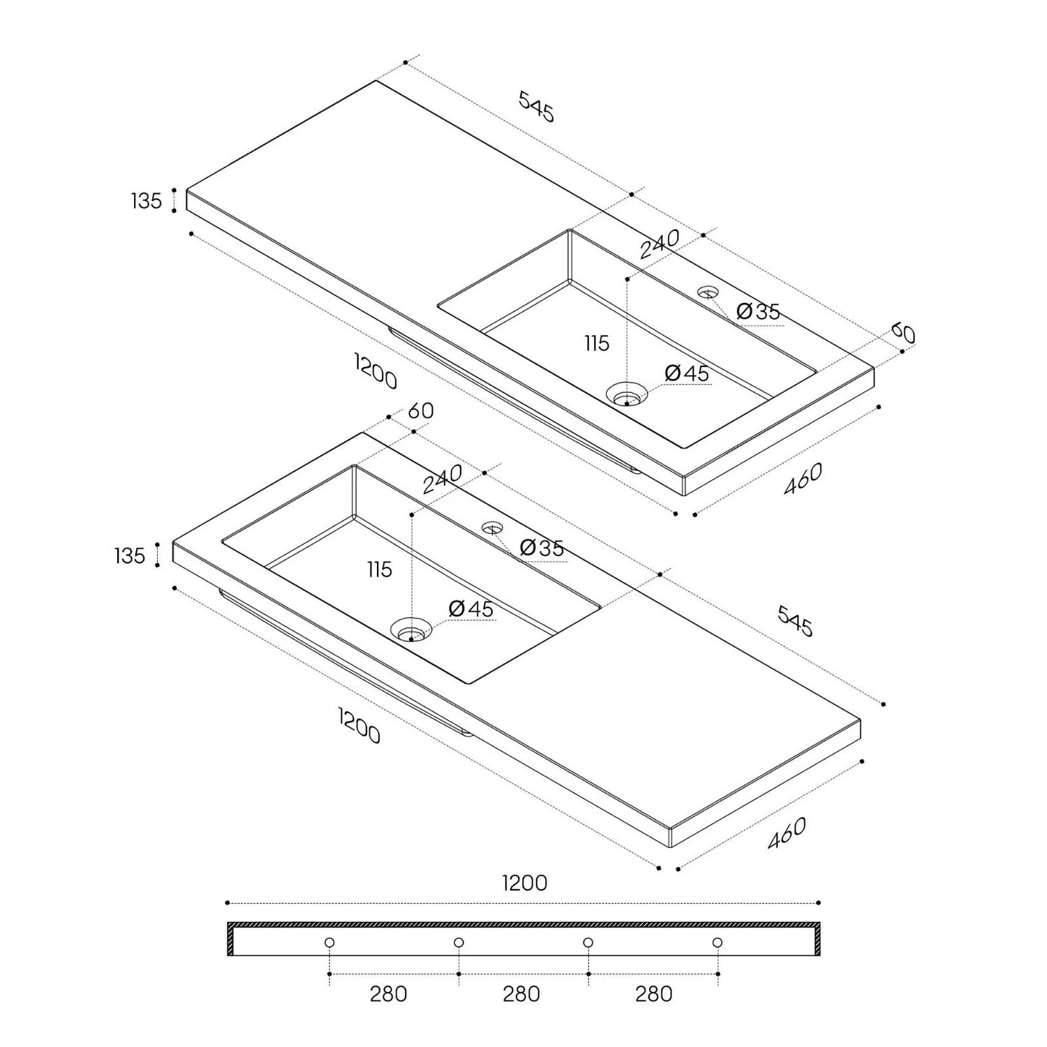 glasvilla Waschbecken Einbauwaschbecken Becken rechts BTH: 120x46x13,5cm Design Waschtisch aus Mineralguss in Weiß Colossum820 - Links ist auf Lager und wird versandt, sobald es wieder verfügbar ist