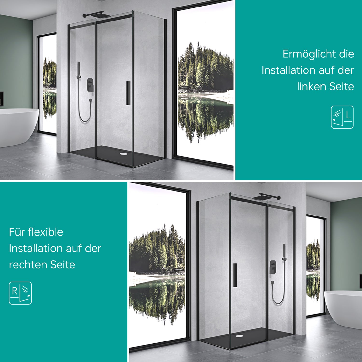 - Seitenelement (Tiefe): 70-140cm | Türfront (Breite): 100-140cm | Höhe: 195cm | Glasart: Klarglas| Farbe: Schwarz