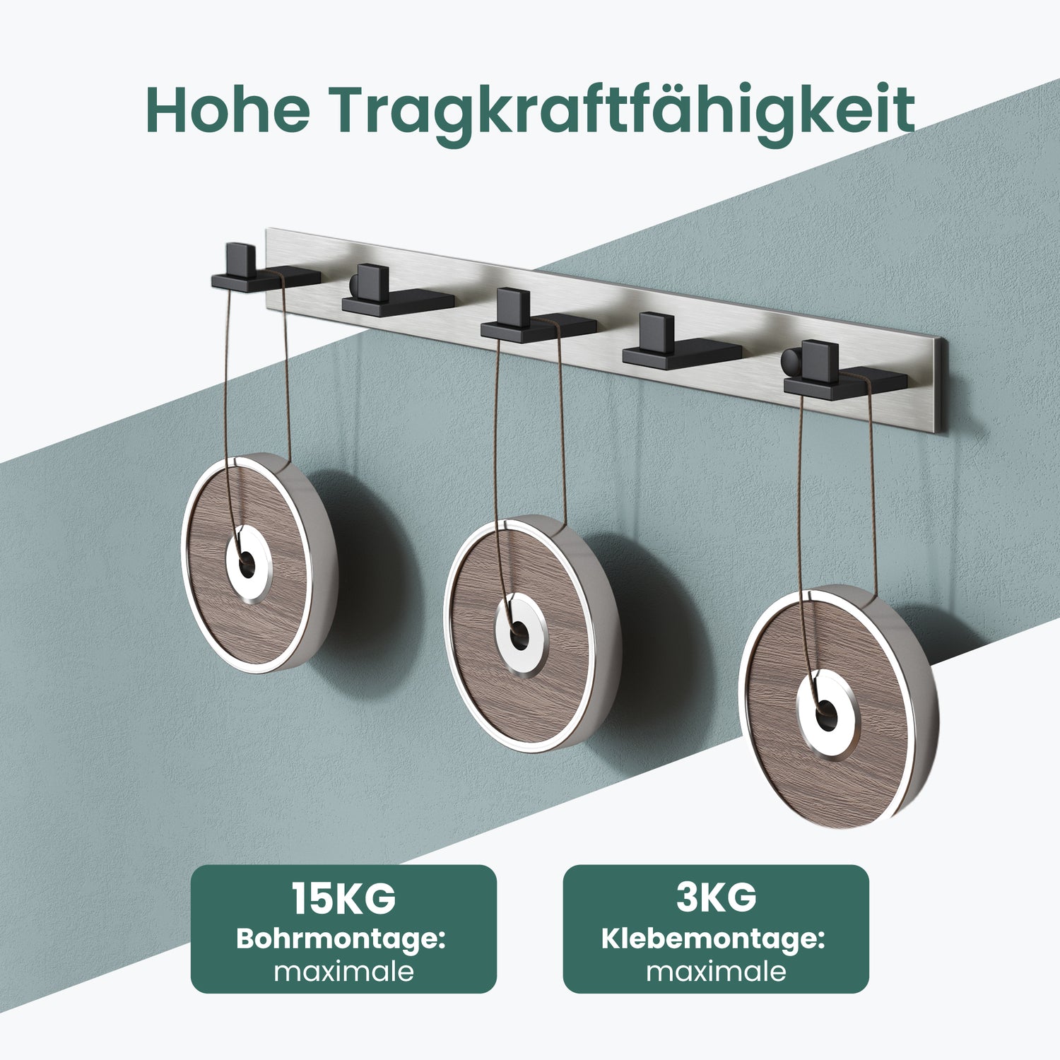 Alta capacidad de carga: montaje con pegamento hasta 3 kg, montaje con taladro hasta 15 kg – el gancho no se deforma, no se cae y es duradero