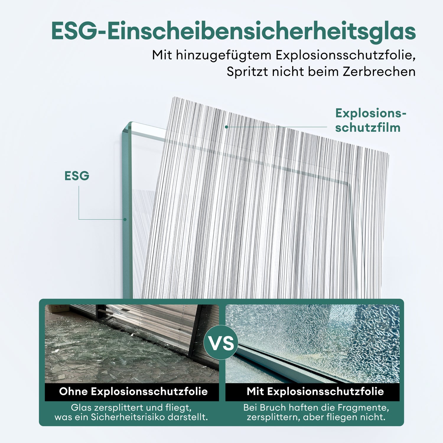- Vidrio de seguridad ESG de 8 mm con película de protección contra explosiones: Vidrio de seguridad robusto con bordes redondeados, que en caso de rotura se descompone en piezas pequeñas y romas, minimizando así el riesgo de lesiones.